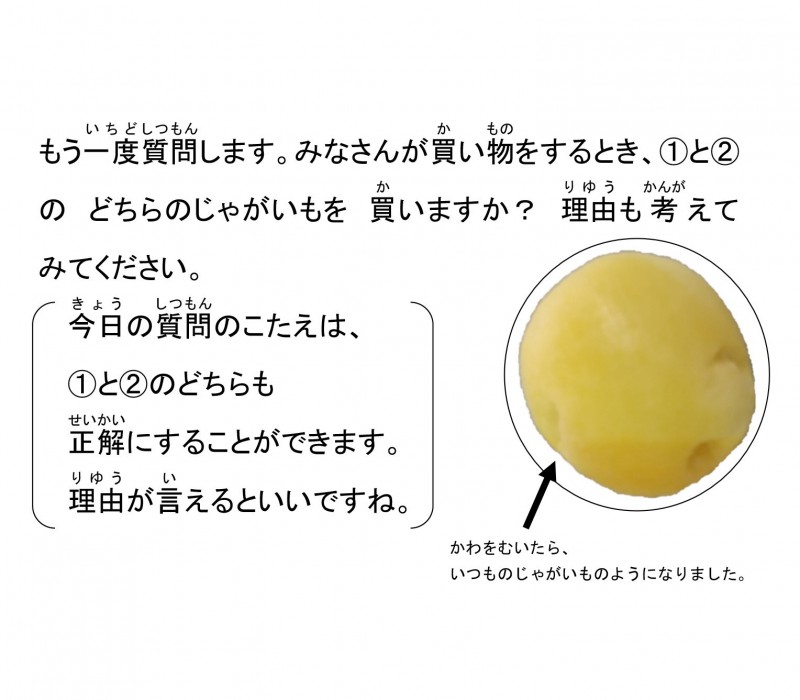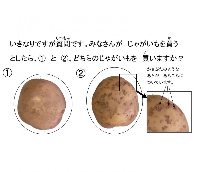 お便りでは冒頭で、そうか病のじゃがいもと病気のないじゃがいもの写真と共に、「みなさんがじゃがいもを買うとしたら、どちらのじゃがいもを買いますか ? 」と問いかけられていました。