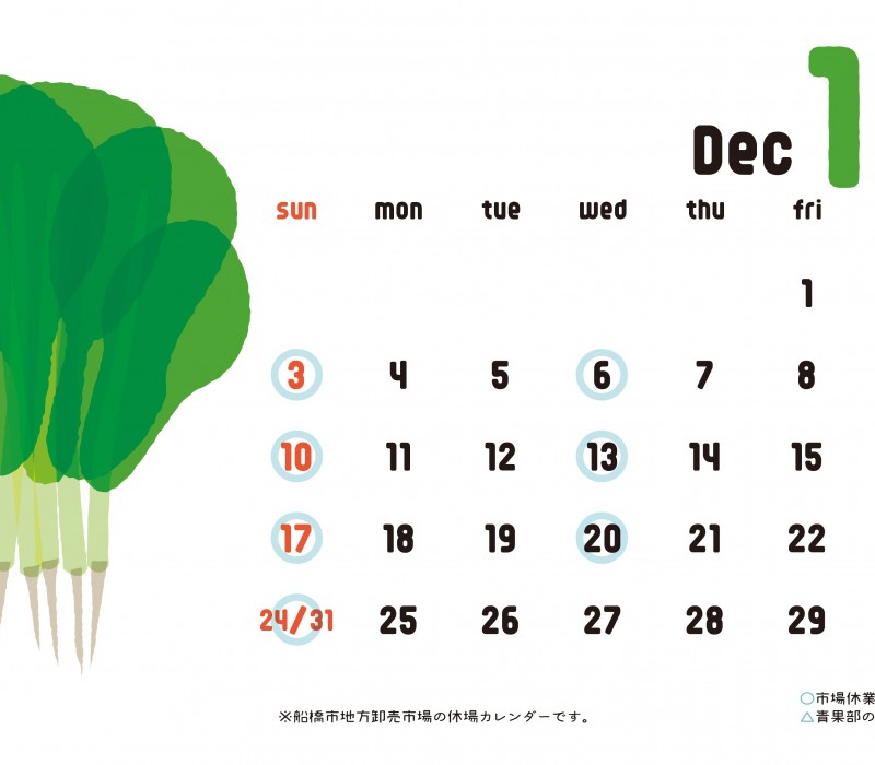 船橋市地方卸売市場の、青果部の休市がわかるカレンダーです。